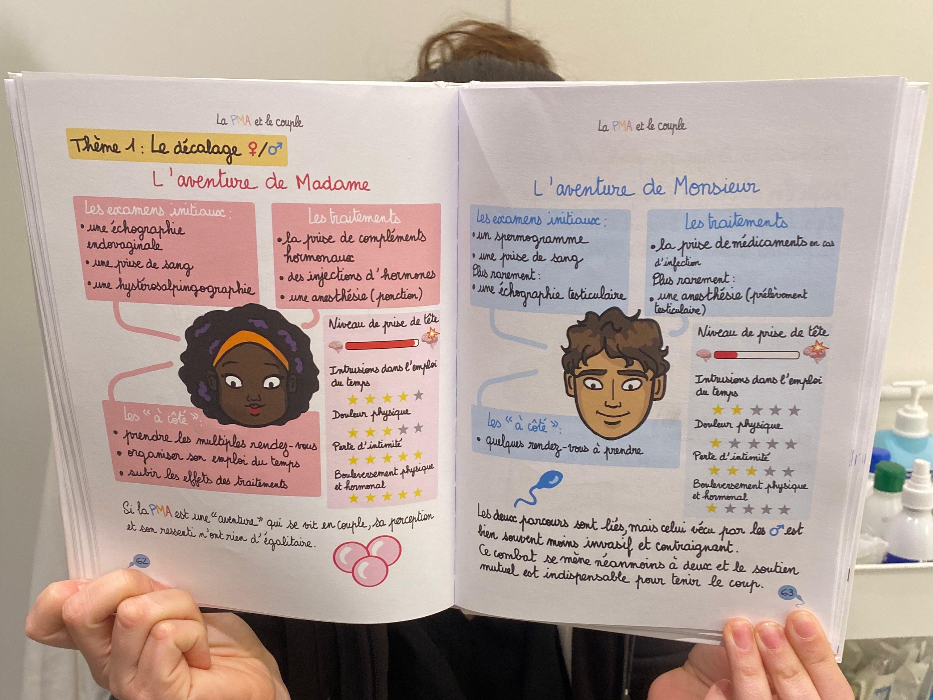 En idioma francés, casi nada más abrir el libro, te topas con una comparativa de qué supone para una mujer y para un varón la reproducción asistida. Y es que, por obvio que pueda parecer, me resulta muy impactante ver resumido en ese cuadrito en colores pastel y adornado con dibujos cute, lo mucho que le cuesta a una mujer resistir todo este periplo, en cuestiones de dolor físico, pérdida de intimidad, inversión de tiempo (y dinero), preparación física y hormonal, y como remate que resume muy bien todo esto, esa barrita en rojo que dice «dolores de cabeza», en un sentido figurado.
